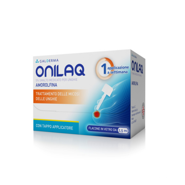 Posologia: Applicare ONILAQ sulle unghie affette una volta alla settimana.Modo di somministrazione. Effettuare l’applicazione dello smalto osservando attentamente le seguenti raccomandazioni: A. Prima di iniziare il primo trattamento con ONILAQ, pulire accuratamente le unghie. Eliminare eventuali strati di smalto precedentemente applicato con un solvente per unghie; poi, con una limetta per unghie, limare la superficie dell’unghia (in particolare la superficie dell’unghia affetta) il più accuratamente possibile. Prestare attenzione a non limare l’area cutanea peri-ungueale. B. La superficie dell’unghia deve essere pulita e sgrassata utilizzando uno dei tamponi detergenti (in dotazione). C. Con uno degli applicatori in dotazione (riutilizzabili) applicare lo smalto su tutta la superficie dell’unghia. Tra un’applicazione sull’unghia e l’altra pulire l’applicatore con il tampone detergente in dotazione, in modo da evitare di contaminare lo smalto medicato per unghie. Non strofinare l’applicatore sul bordo del flacone stesso. D. Per evitare di contaminare lo smalto, l’applicatore deve essere accuratamente pulito con uno dei tamponi detergente forniti, dopo ogni applicazione, prima di procedere con il trattamento di un’altra unghia. E. Se lo smalto viene a contatto con la parte esterna del tappo, pulire con un tampone detergente in dotazione per evitare il contatto con la cute. F. Tenere il flacone ben chiuso. Ripetere il procedimento per ognuna delle unghie affette. Dopo ogni applicazione di ONILAQ,è importante lavare le mani. Se l’applicazione avviene sulle unghie delle mani, attendere che lo smalto sia completamento asciutto prima di procedere al lavaggio. Il trattamento deve essere continuato senza interruzioni fino a quando l’unghia siè rigenerata e le aree colpite sono finalmente guarite. In generale, la durata del trattamentoè di 6 mesi per le unghie delle mani e 9 mesi per le unghie dei piedi (la durata dipende essenzialmente dall’intensità, dalla localizzazione, dalla velocità di crescita dell’unghia e dall’estensione dell’infezione). Dopo un trattamento di 3 mesi senza risultati, consultare il medico.Istruzioni speciali: Le limette utilizzate per unghie malate non devono essere utilizzate per le unghie sane. Prima di ogni nuova applicazione, rimuovere ogni residuo di smalto, limare le unghie colpite, se necessario, e poi pulirle sempre con un tampone detergente.
